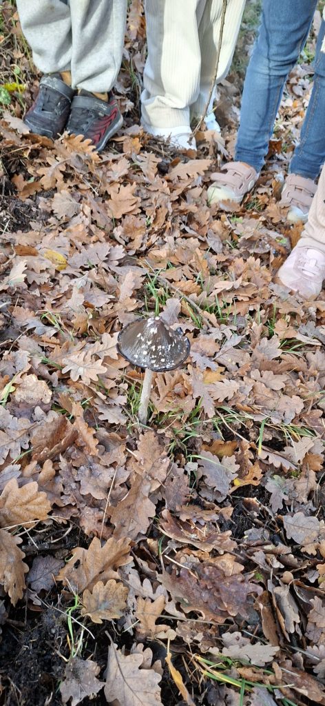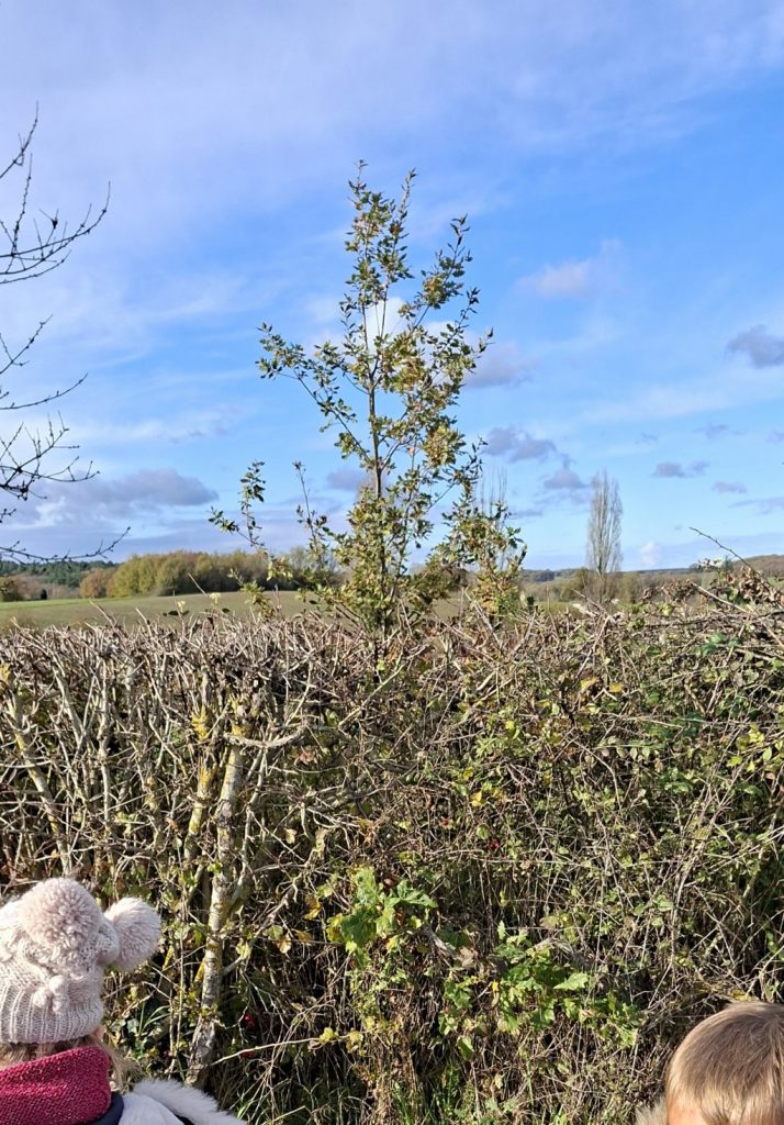 Sur la route nous avons trouvé des feuilles de chêne marron, mais il n’y avait pas de chêne. Nous avons suivi les feuilles et nous avons trouvé un chêne dans une haie. Un peu plus loin dans la forêt il y avait beaucoup de chênes. Nous avons ramassé des feuilles et des glands. Il y avait des glands qui avaient germé.