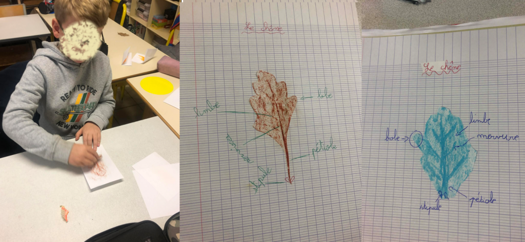 Nous avons aussi ramassé des feuilles tombées par terre. En classe, nous avons fait leur empreinte avec de la craie grasse, puis nous avons fait un schéma avec les différentes parties qui composent la feuille.