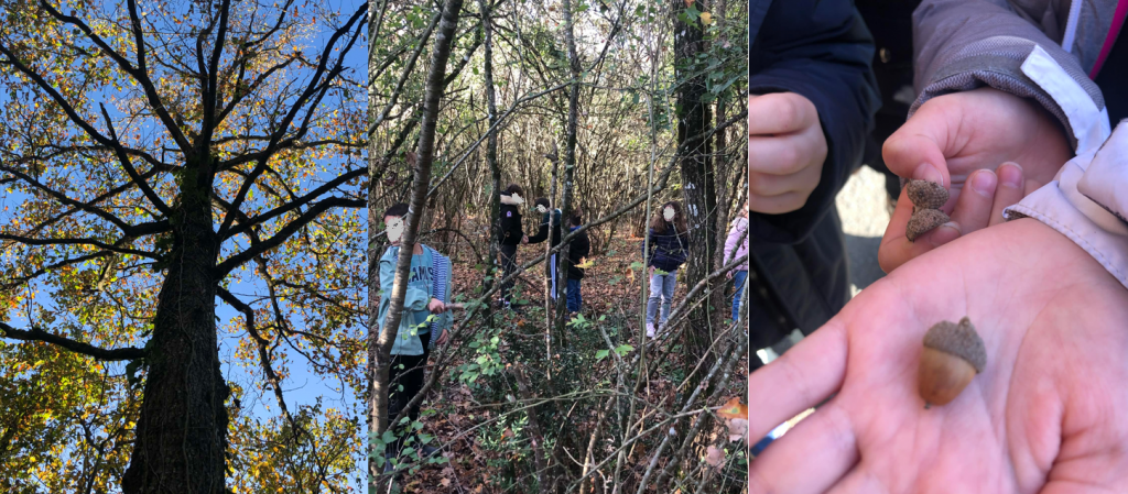 Nous avons trouvé de nombreux chênes à l’entrée de la forêt de Scévolles. Nous y sommes allés le 18 novembre. Nous avons non seulement pu observer les chênes, mais aussi beaucoup d’autres végétaux que nous n’avons pas encore finis d’identifier. Nous avons récupéré des glands tombés au sol, avec ou sans leur cupule.
