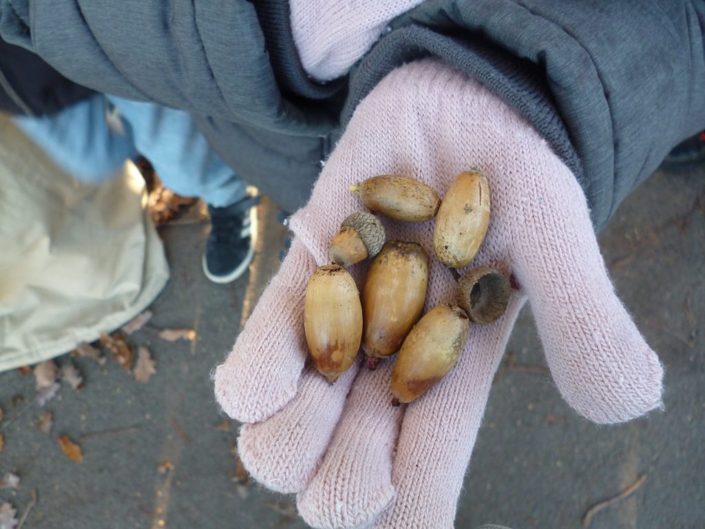 Nous avons trouvé un chêne dans les rues de Chabournay. Il y avait des glands et des feuilles par terre.
