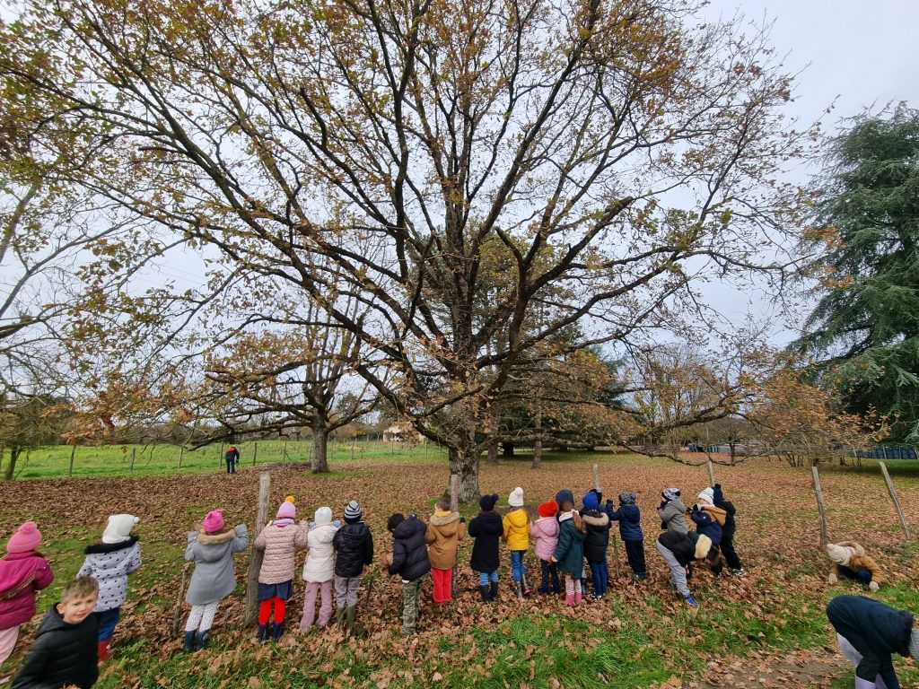Nous avons d’abord trouvé et ramassé des feuilles par terre puis nous avons vu un très très grand chêne dans un pré.
