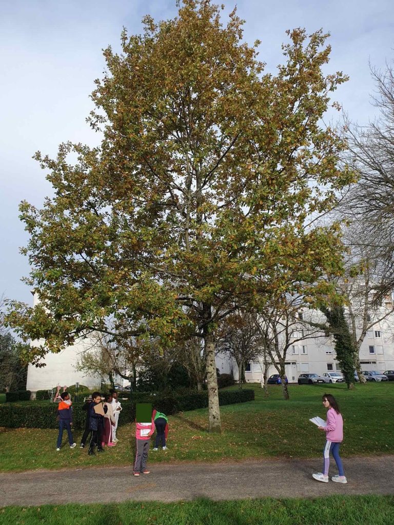 En classe dehors, nous avons cherché des chênes dans le parc Mozart. Le premier chêne rencontré n’était pas un chêne pédonculé. Un peu plus loin dans le parc, nous avons vu des glands avec un long pédoncule sous un autre chêne. Nous avons trouvé un chêne pédonculé.