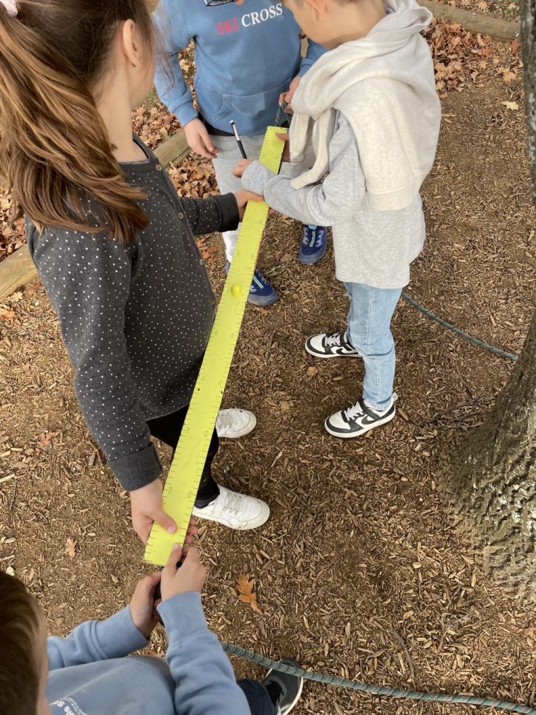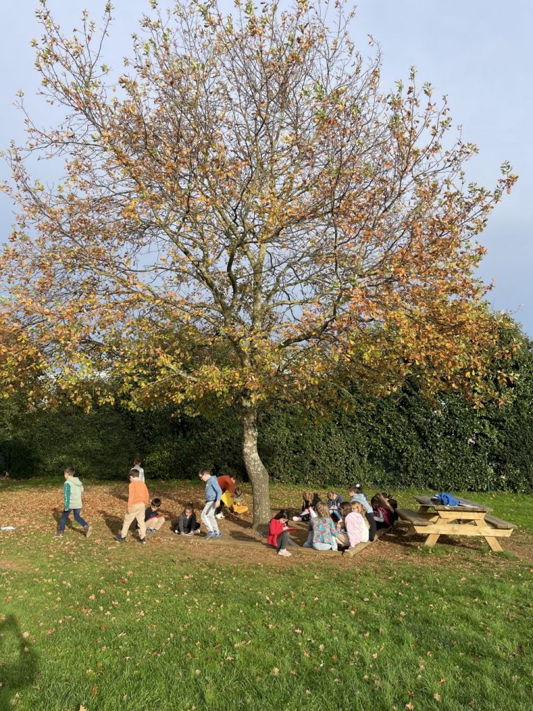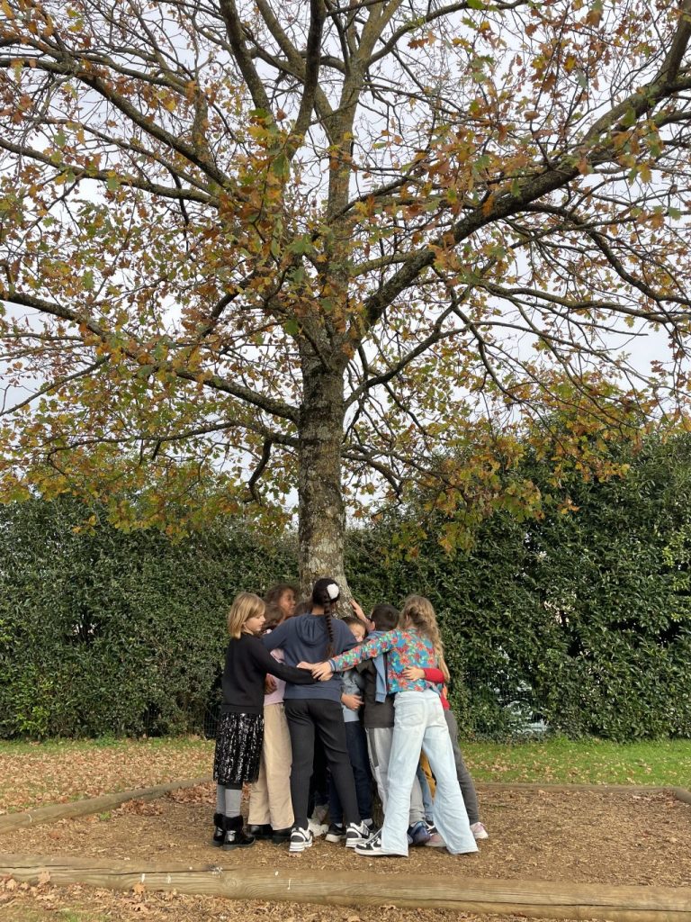Cette quête a été très facile pour nous : dès que nous avons écouté l’avis de recherche, nous sommes plusieurs à avoir pointé du doigt le chêne de la cour qu’on voit des fenêtres de la classe. Nous l’avons dessiné, mesuré, admiré… Pour la circonférence du tronc, on a utilisé une corde et la grande règle de la classe. Nous lui avons même fait un gros câlin…