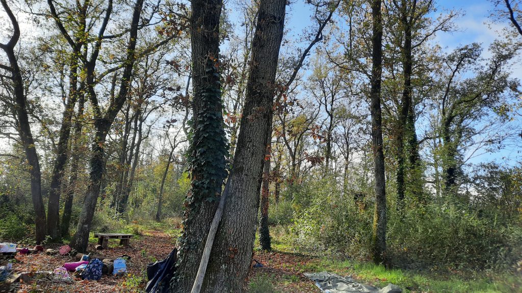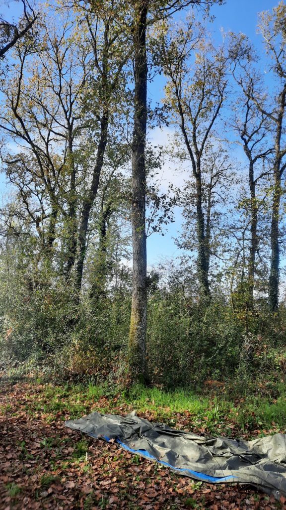 Lorsqu’on fait classe dehors nous nous retrouvons dans un bois près de l’école. Notre coin regroupement se trouve au milieu de plusieurs chênes.