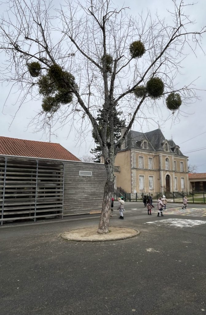 Nous avons du gui dans la cour de l’Ă©cole. Il est sur un arbre. On doit attendre le printemps pour voir ses feuilles et trouver son nom. On a vu les boules du gui sur la photo en zoomant.