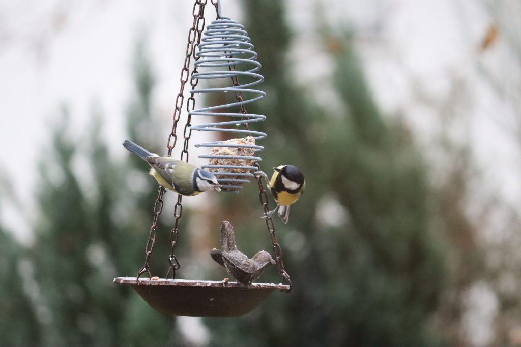 Dans la mangeoire installée devant la classe, on peut y voir, depuis la rentrée, un rouge gorge, des mésanges bleues et des mésanges charbonnières.