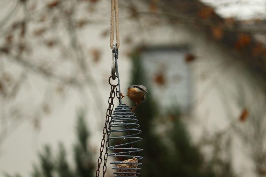 Pour tenter de faire venir les chardonnerets dans notre cour d’école, nous avons installé des mangeoires dans le chêne juste en face de nos fenêtres de classe. Ce n’est pas un franc succès pour l’instant. Seul un petit rouge gorge est venu manger les quelques graines tombées au sol. (début décembre)