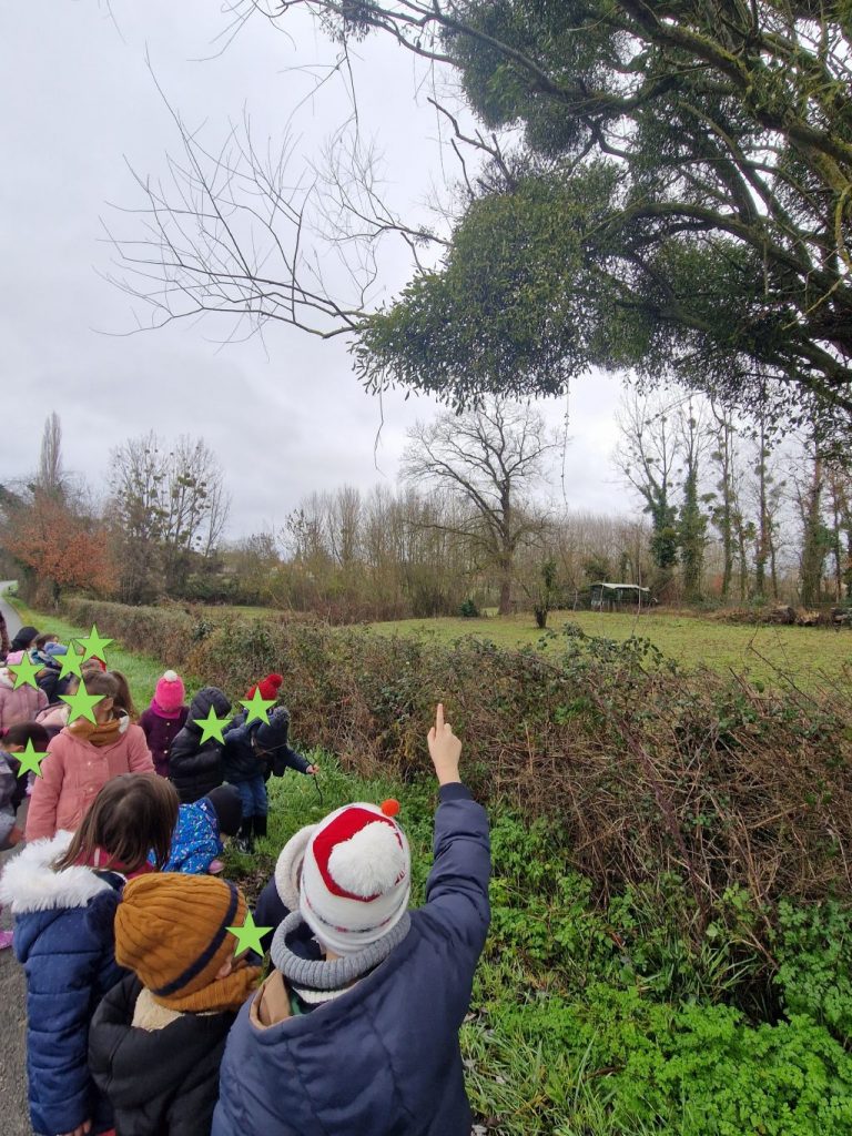 Ça ressemble à une grosse boule avec des feuilles vertes, avec des petits pompons verts et des petites boules empoisonnées et blanches. On a trouvé dans les arbres, ça pousse en boule. On a marché beaucoup !