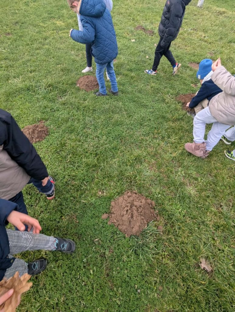 En chemin, nous avons aperçu un gendarme, un escargot et aussi des taupinières. Nous te mettons quelques photos.
