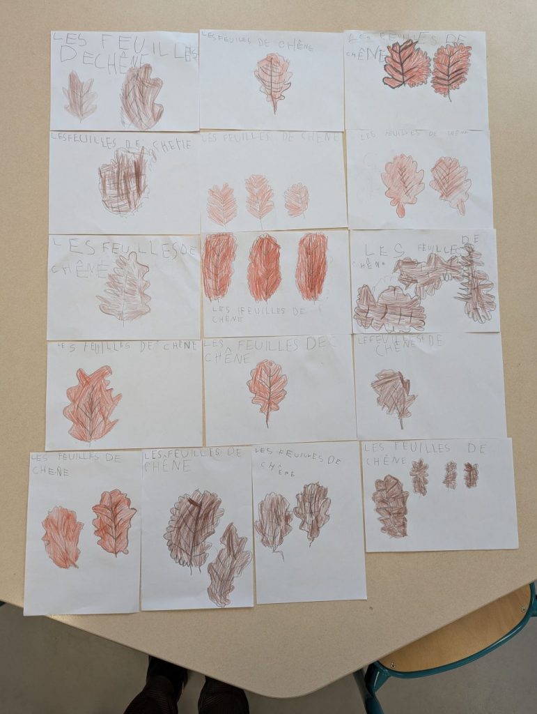 Nous sommes partis nous promener aux abords de l’école et c’est au parc des sablons que nous avons trouvé des feuilles de chêne qui nous ont mené ensuite à l’arbre. Nous les avons ensuite observé et dessiné en classer