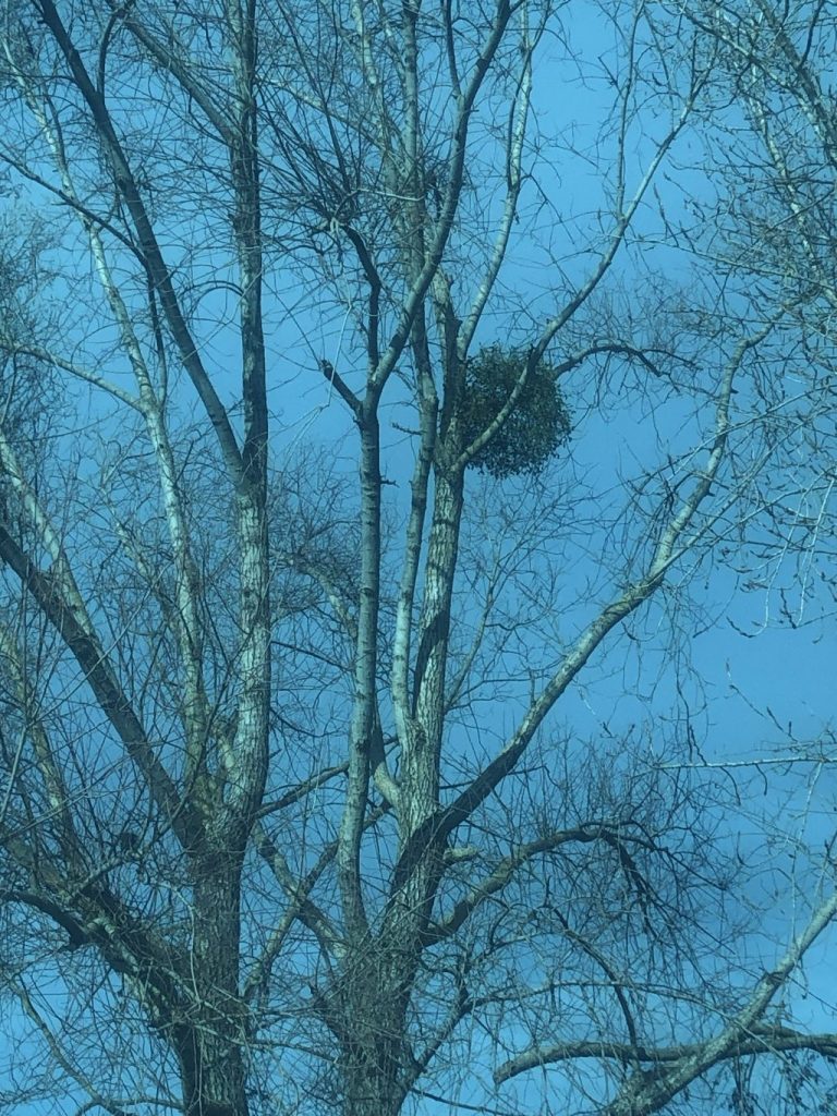 En allant au musée de la bande dessinée à Angoulême, nous avons trouvé un gui dans un arbre. Puis maitresse a trouvé au cours d’une promenade une boule de gui tombée au sol et nous avons pu voir les fleurs jaunes.
