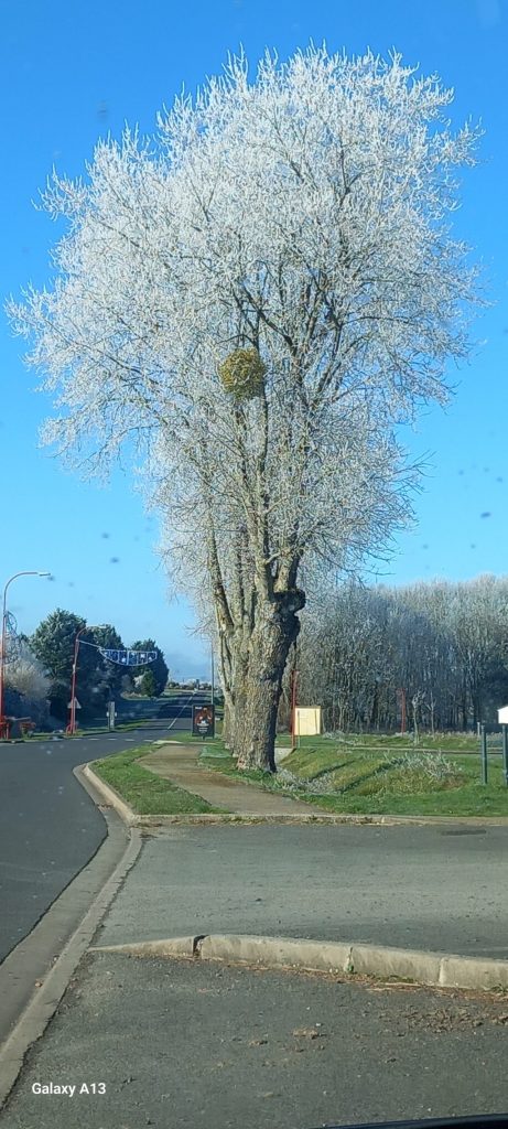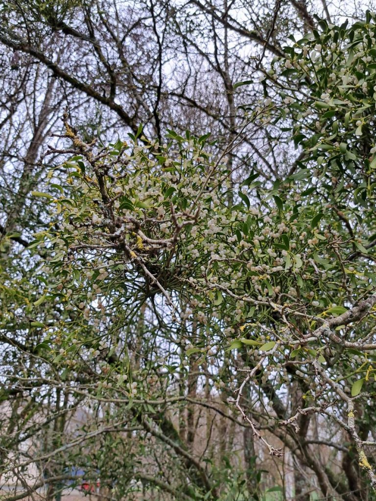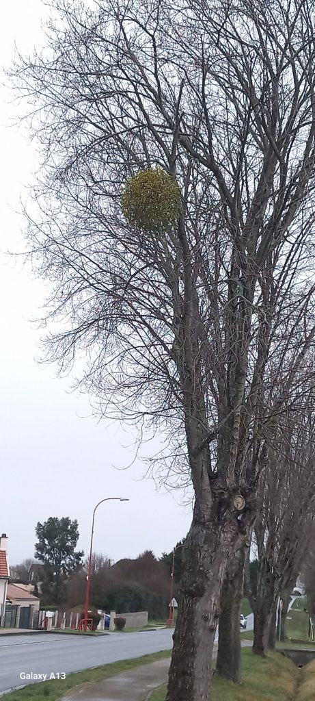 Sur la photo avec l’arbre gelé, on voit bien la boule de Gui. Sur la photo d’Axel, on voit très bien les boules blanches (les fruits du gui). Il ne faut pas les manger parce qu’elles sont toxiques pour les humains.