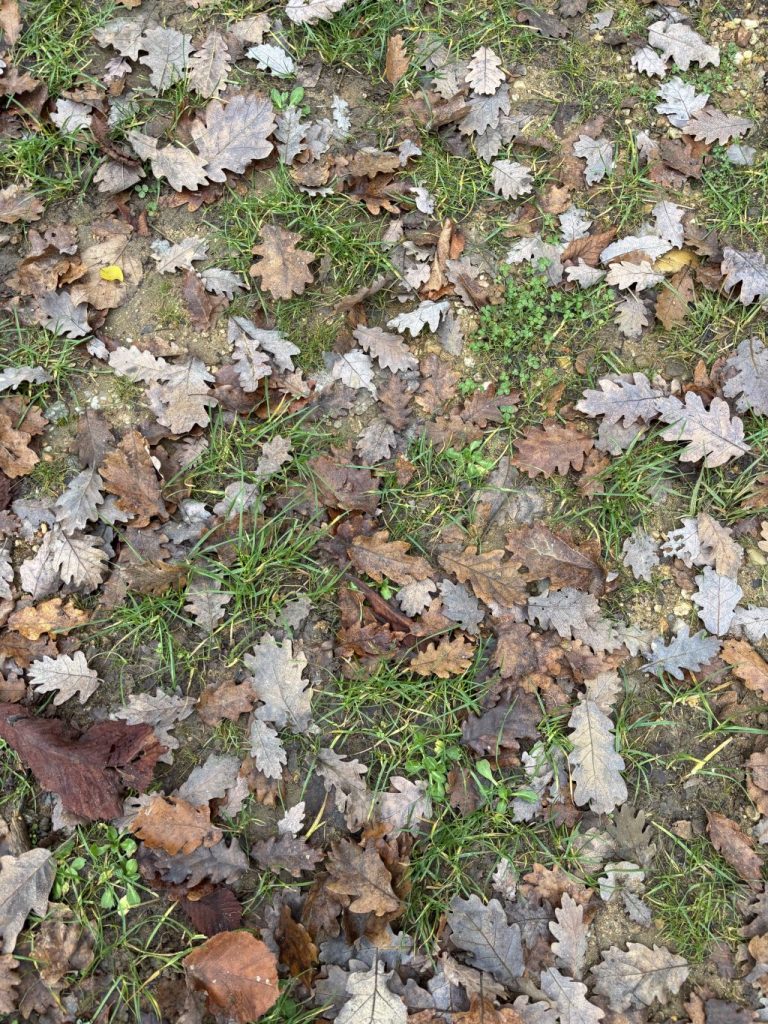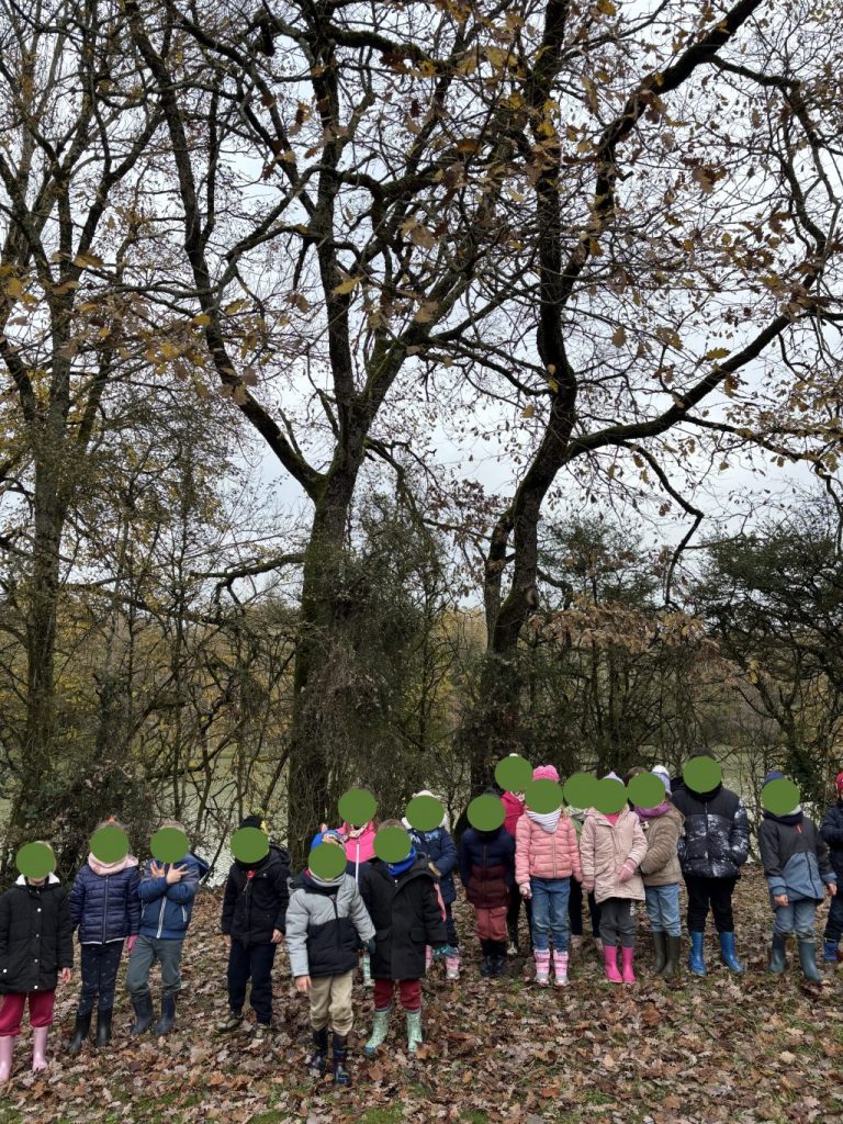 Il y avait des feuilles dans tous le chemin qui va jusqu’à l’endroit où on fait les ateliers à l’étang de Lussac. On pense qu’il y a plusieurs chênes dans cette allée.