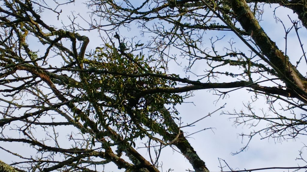En levant la tĂȘte, nous avons vu du gui dans un arbre de la cour des CP. Il y avait des boules blanches par terre.