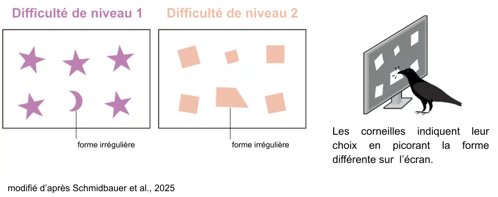 Une expérience menée en 2025 par des scientifiques de l’Université de Tübingen en Allemagne a testé les capacités des corneilles noires (Corvus corone corone) à reconnaître différentes formes géométriques.