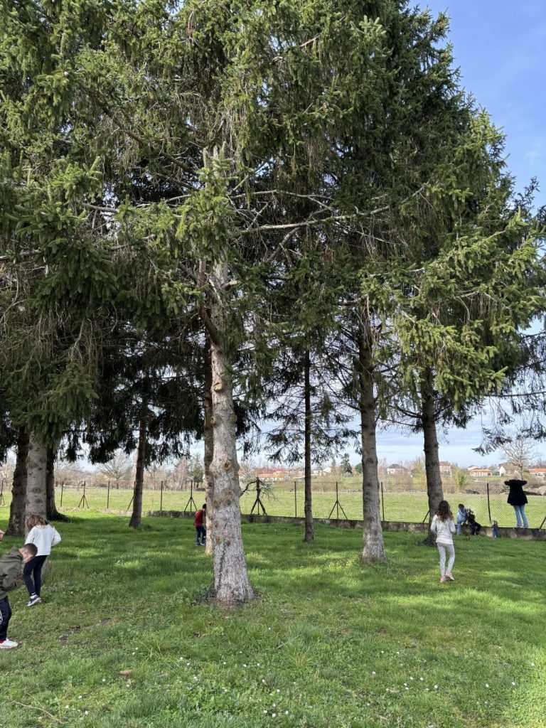 La classe de CP/CE1/CE2 a trouvĂ© des sapins blancs Ă  l’arriĂšre de l’Ă©cole. Ils mesurent de 7 Ă  10 m.