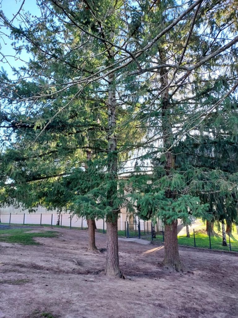 Au retour de l’exposition avicole de Montmorillon, nous avons traversĂ© le stade Ă pied et aperçu 3 grands sapins dans la cour de l’Ă©cole Ă©lĂ©mentaire.