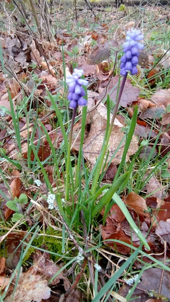 Elle a également de longues feuilles vertes. Elle s’appelle le muscaris ou la jacinthe en grappes.