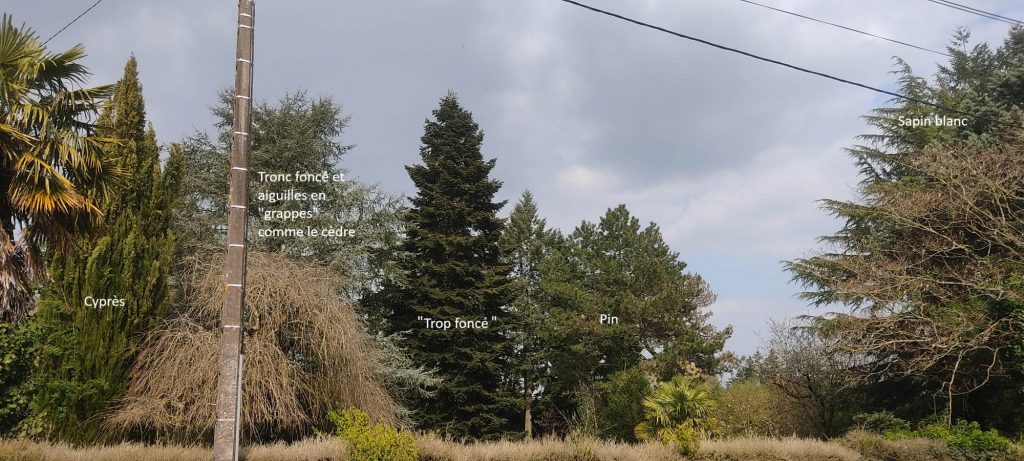 On est allĂ©s dans des endroits avec beaucoup d’arbres. Nous avons comparĂ© plusieurs variĂ©tĂ©s d’arbres au feuillage persistant, de rĂ©sineux, de conifĂšres. Nous avons trouvĂ© des pins (aux trĂšs grandes aiguilles), des Ă©picĂ©as (aux aiguilles courtes et piquantes) que nous avons au dĂ©but confondu avec du douglas et du sapin, des cyprĂšs (ils ont des petits cĂŽnes en Ă©caille) et enfin un sapin blanc.