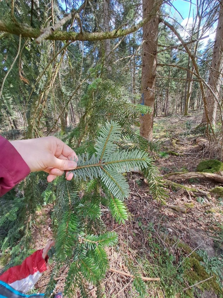 Comme ils sont très hauts et qu’ils sont verts car ils gardent leurs aiguilles, nous sommes montés en haut de la Manu à Châtellerault pour voir où il y avait des sapins… Nous avons regardé au loin. Yasser avait apporté ses jumelles. En nous promenant ensuite, nous avons trouvé plein de conifères.. En nous approchant, nous avons trouvé des ifs, des cèdres…. mais pas de sapin blanc… Heureusement ce week-end, Hector est sorti en forêt avec ses parents et il a regardé les aiguilles du sapin. Hourra, il y avait les 2 bandes blanches sur les aiguilles ! c’était bien un sapin blanc !