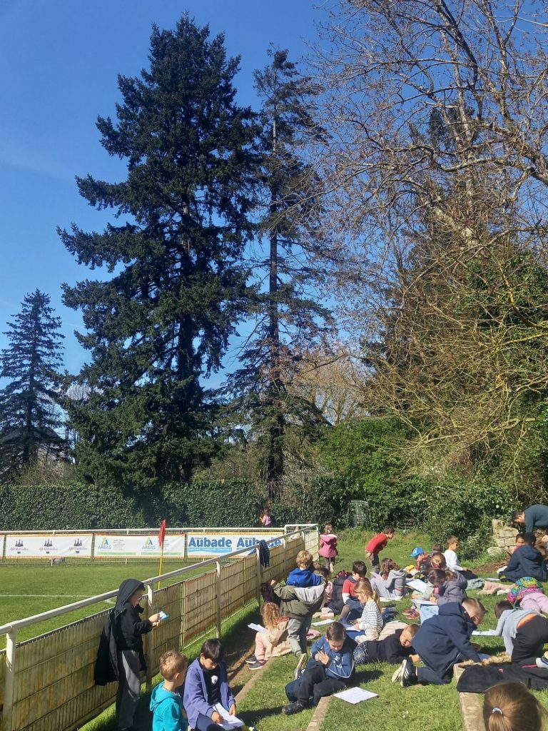 Nous sommes partis avec la classe de CP au stade en face de l’Ă©cole. Sur le chemin nous avons vu des canards qui faisaient leur sieste au soleil en bord de Vienne. Au stade nous avons pu voir deux grands sapins blancs : nous avons observĂ© leurs troncs (mĂȘme si on ne pouvait pas s’approcher trĂšs prĂšs), leurs Ă©pines.