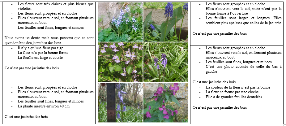 Nous avons trouvé plusieurs plantes avec des fleurs violettes, mais pas de jacinthe pendant le temps de classe dehors. Par contre, plusieurs élèves en ont trouvé et ont envoyé des photographies, que nous avons comparé pour déterminer quelles étaient les jacinthes des bois (voir photo ci-dessous)
