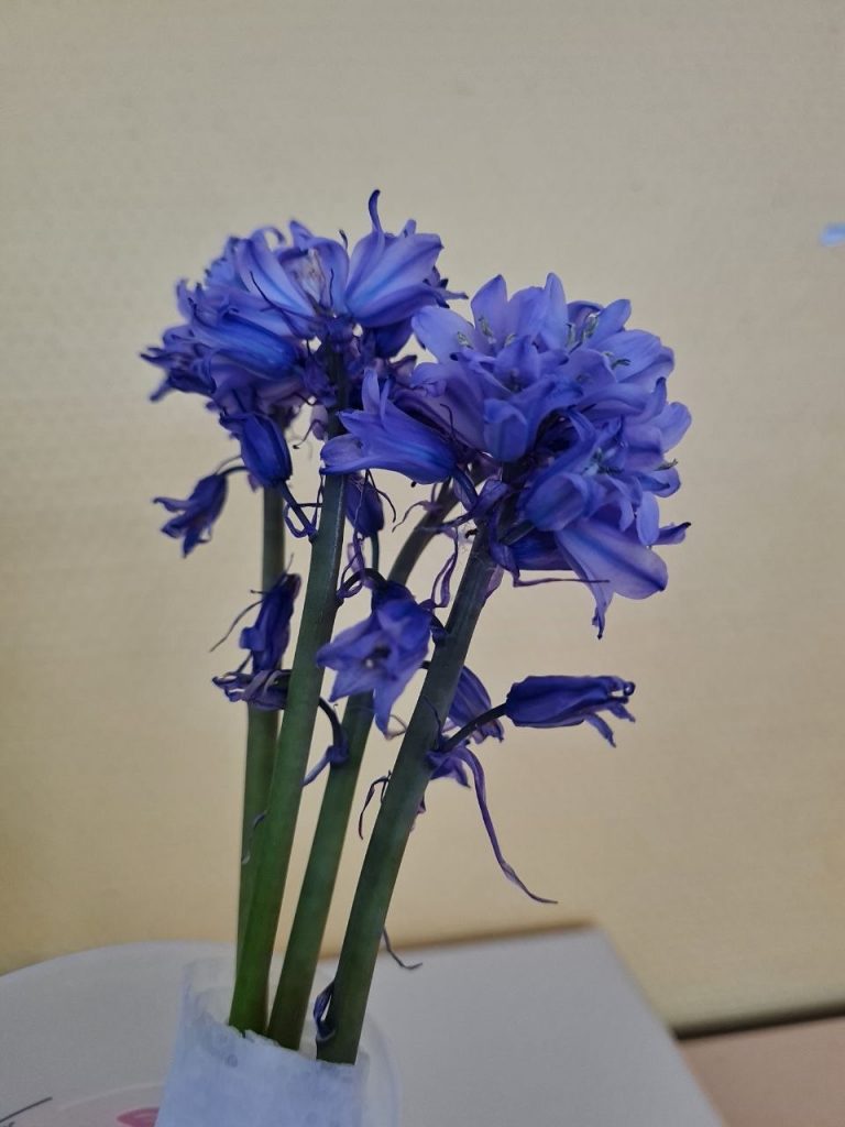 Nous sommes allés dans le parc de la salle des fêtes pour chercher la jacinthe des bois, mais nous n’en avons pas trouvé. La maîtresse a donc envoyé un message aux parents pour qu’ils puissent nous aider. Ce matin, c’est Sarah qui nous en a rapporté en classe ! Elle les a trouvées avec ses parents dans une forêt. Nous avons pu observer ses clochettes violettes.