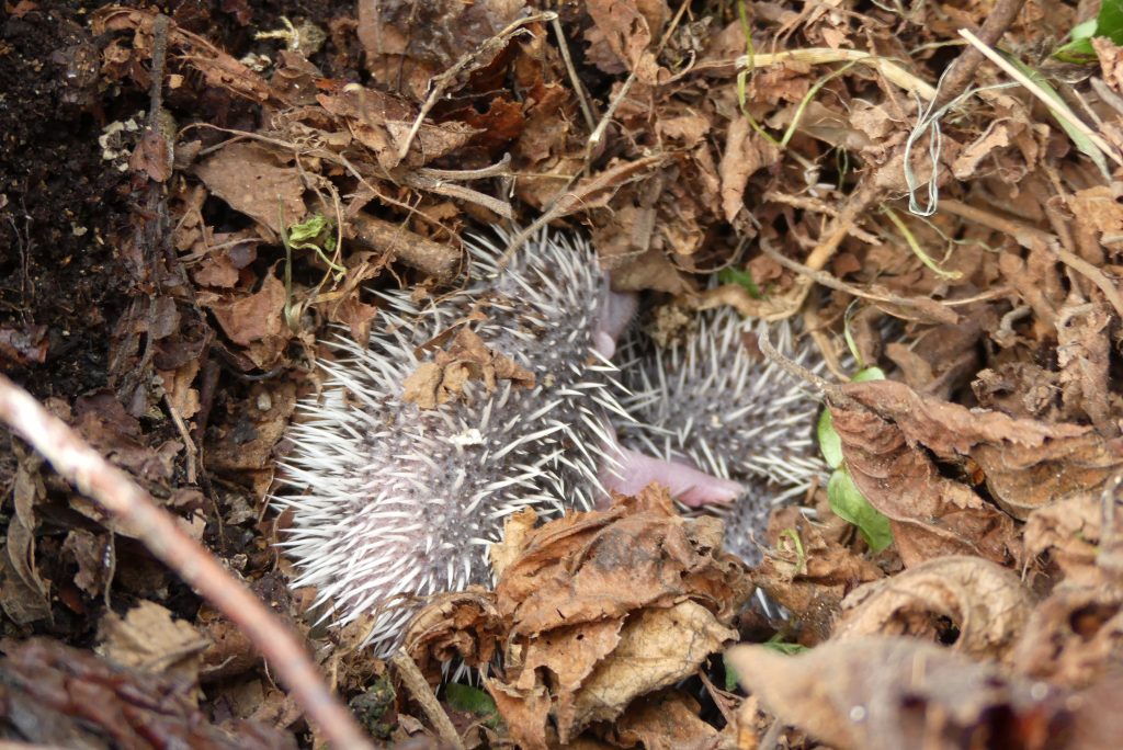 Mickaël, employé à la commune, est venu nous chercher dans la classe, car il venait de déranger un hérisson dans un tas de feuilles (en photo). Toute la classe est venue observer l’endroit et… en soulevant les feuilles, nous avons découvert plusieurs choupissons dans leur nid. Le hérisson dérangé était sans doute leur maman. Alors, nous avons vite remis les feuilles et les avons laissé tranquilles. Sur la photo, ils ont peut-être 3 semaines. Leurs piquants blancs seront bientôt remplacés par des piquants qui les protègeront mieux des prédateurs. Des élèves de la classe ont aussi trouvé des hérissons chez eux.