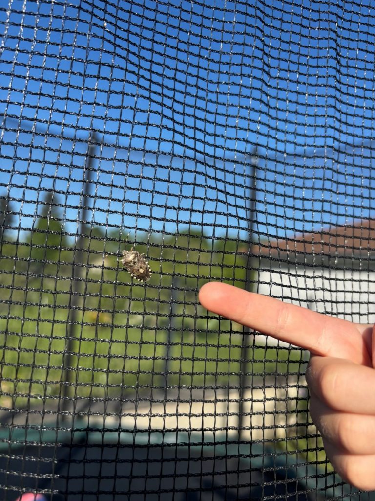 Théa sautait dans le trampoline. Elle a vu des petites bêtes et elle s’est approchée : c’était des punaises grises.