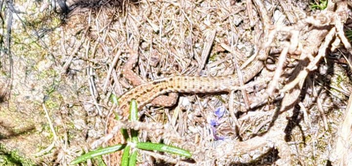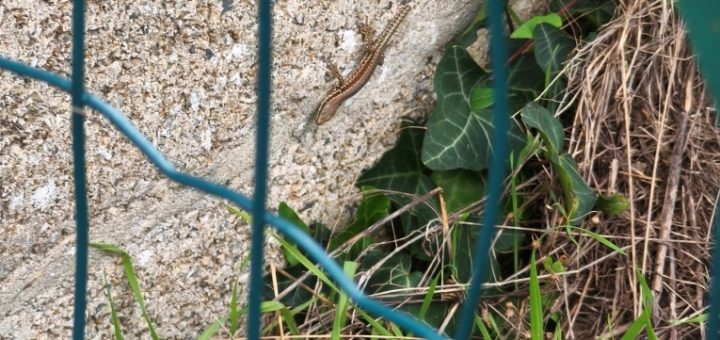 En revenant de la salle des sports, nous avons aperçu un petit lézard des murailles qui profitait des rayons du soleil. Nous n’avons pas pu l’approcher car il a vite filé en nous apercevant.