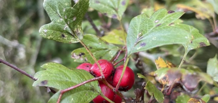 On a trouvé l’aubépine au Bois des Lutins. Elle n’avait aucune fleur mais des baies rouges. Les feuilles sont vertes.On n’a rien cueilli pour laisser les fruits aux oiseaux.