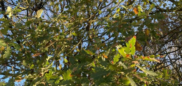 Sur le chêne poussent des glands. Ce sont des fruits. On en a ramassé un qui avait germé : une petite racine sortait en bas du gland.