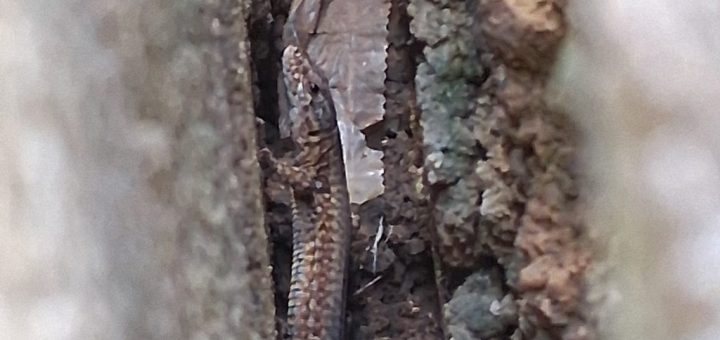 Nous avons aperçu le lézard sur un mur de l’école. Nous nous sommes approchés trop vite et le lézard a eu peur. Il s’est caché entre deux murs.