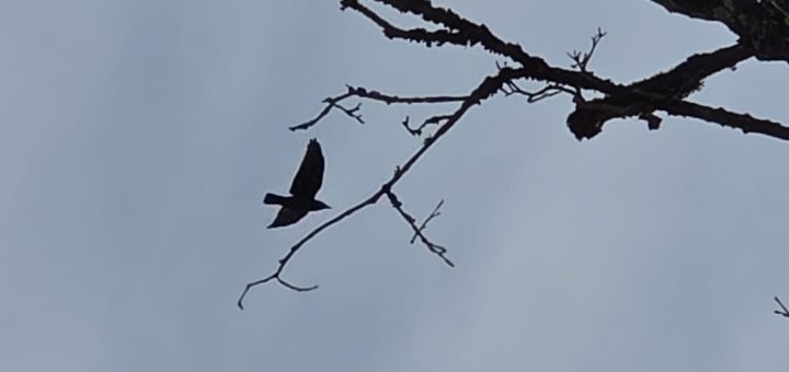 Nous avons reconnu la corneille de par son plumage noir brillant et son cri. Nous n’avons pas fait de bruit mais elle s’est envolée.
