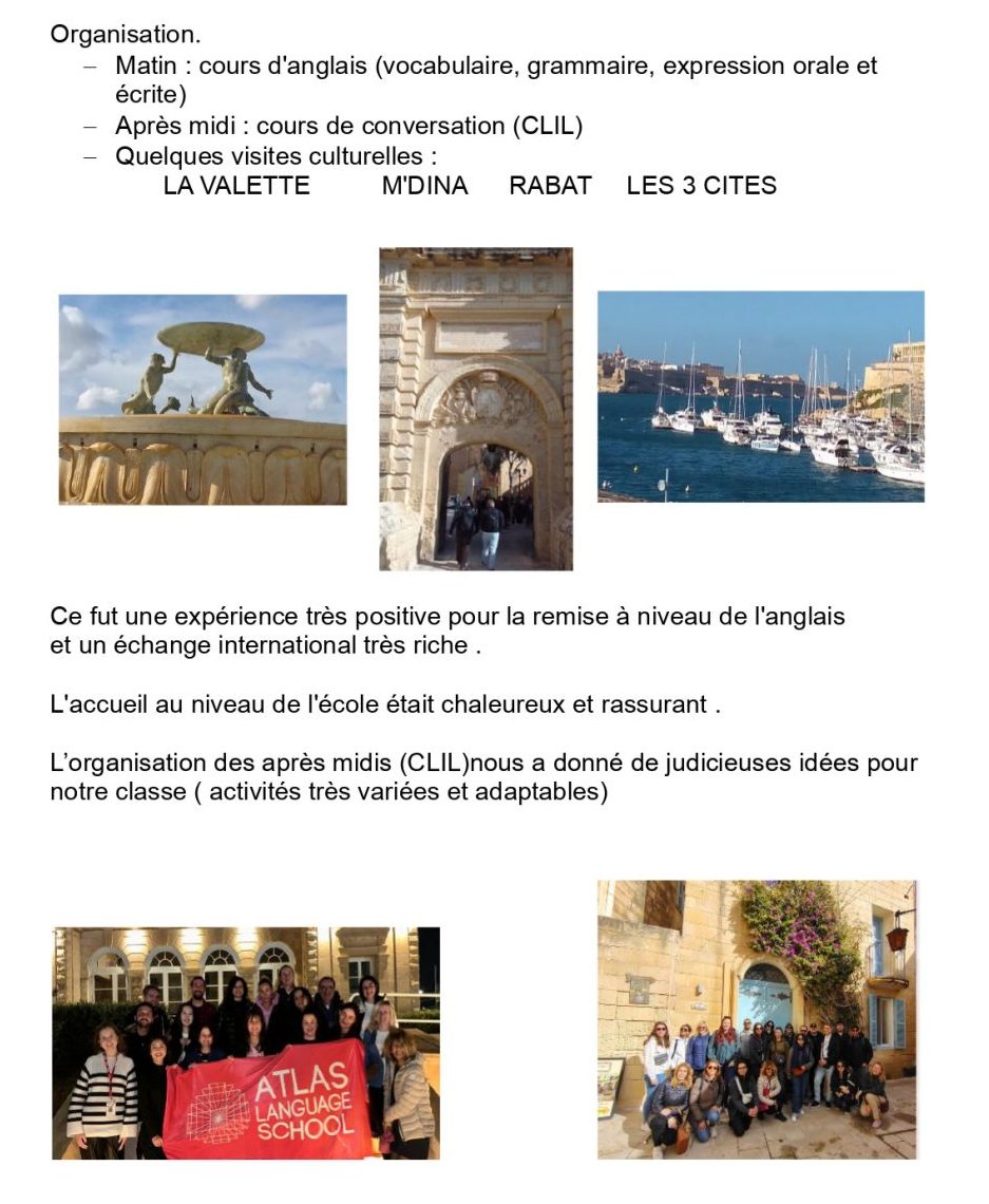La professeur, d’origine américaine, a été très bienveillante avec nous. L’apprentissage en grammaire, prononciation était très vivant, essentiellement basé sur des jeux en interaction. Le programme EMILE a été plus décevant, parce qu’avec toute la bonne volonté du monde, notre professeur n’était pas formée à cette méthode. Néanmoins, nous avons pu créer une séquence complète avec les collègues sur la musique et des échanges des séquences préparées par les collègues seront mutualisées.