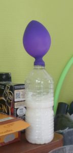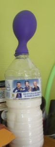 En classe, on a pris une bouteille vide.Dans la bouteille, on a mis de la levure,du sucre, de la farine et de l’eau.On met le ballon sur l’ouverture de la bouteille.