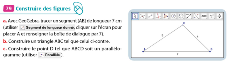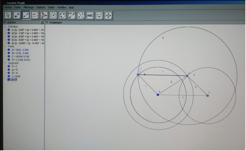 Par exemple, dans la construction d’un triangle, ayant pour données trois longueurs des côtés, l’élève a appris qu’il fallait tracer des arcs de cercle pour obtenir le troisième sommet. Il doit donc comprendre que c’est l’outil cercle qu’il doit utiliser sur GeoGebra.