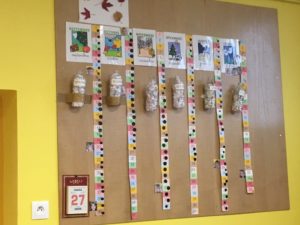 Le calendrier des petits et moyens allie la comptine des nombres et la notion de quantité (chaque jour on met le feuillet du petit calendrier dans la bouteille, qui se remplit au fur et à mesure du mois).