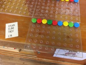 Puis les grands font un petit jeu : un enfant s’assoit sur une chaise, les autres sont assis sur un tapis devant lui. Il choisit un nombre qu’il écrit sur une ardoise. Puis les autres élèves posent des questions comme : “Est-ce que c’est avant 23 ?” auxquelles il répond, jusqu’à ce qu’un élève trouve le bon nombre.