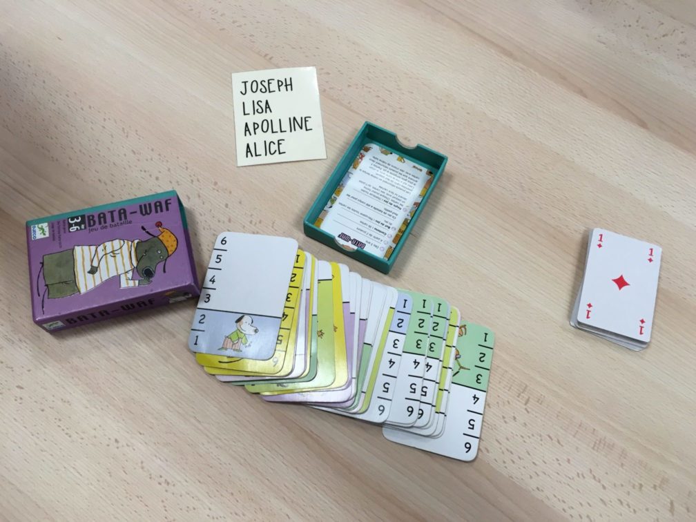 Quatre élèves de moyenne section jouent par deux à la bataille en alternance entre deux jeux : les cartes d’un jeu classique (de l’as au 6) ou le jeu Bata-waf dans lequel les chiffres de 1 à 6 sont symbolisés par des cartes ayant un code couleur et dont la taille du chien qui y est dessiné est fonction du chiffre.