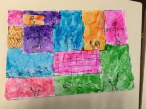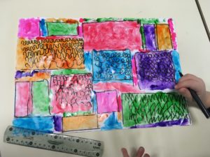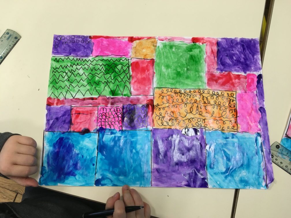 Les grands font une activité de géométrie. Ils ont lors des séances précédentes tracé sur une feuille blanche des rectangles et des carrés à l’aide de gabarits, qu’ils ont ensuite peint de différentes couleurs. Ce jour il doivent repasser au feutre noir les bords des carrés et rectangles avec une règle. Puis is doivent garnir les carrés et rectangles de signes d’écriture ou de dessins.