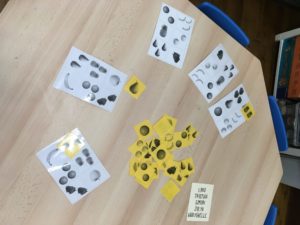 Des élèves de petite section disposent chacun d’une fiche composée de cases contenant chacune un nombre de fruits (allant de 1 à 3). Des cartes jaunes identiques aux cases sont étalées au milieu de la table : il y a par exemple une carte avec une poire, une carte avec deux poires, une carte avec trois poires, de même pour les ananas, les bananes, etc… Ils doivent reconnaître les cartes jaunes correspondant à leur fiche et les placer sur les bonnes cases.