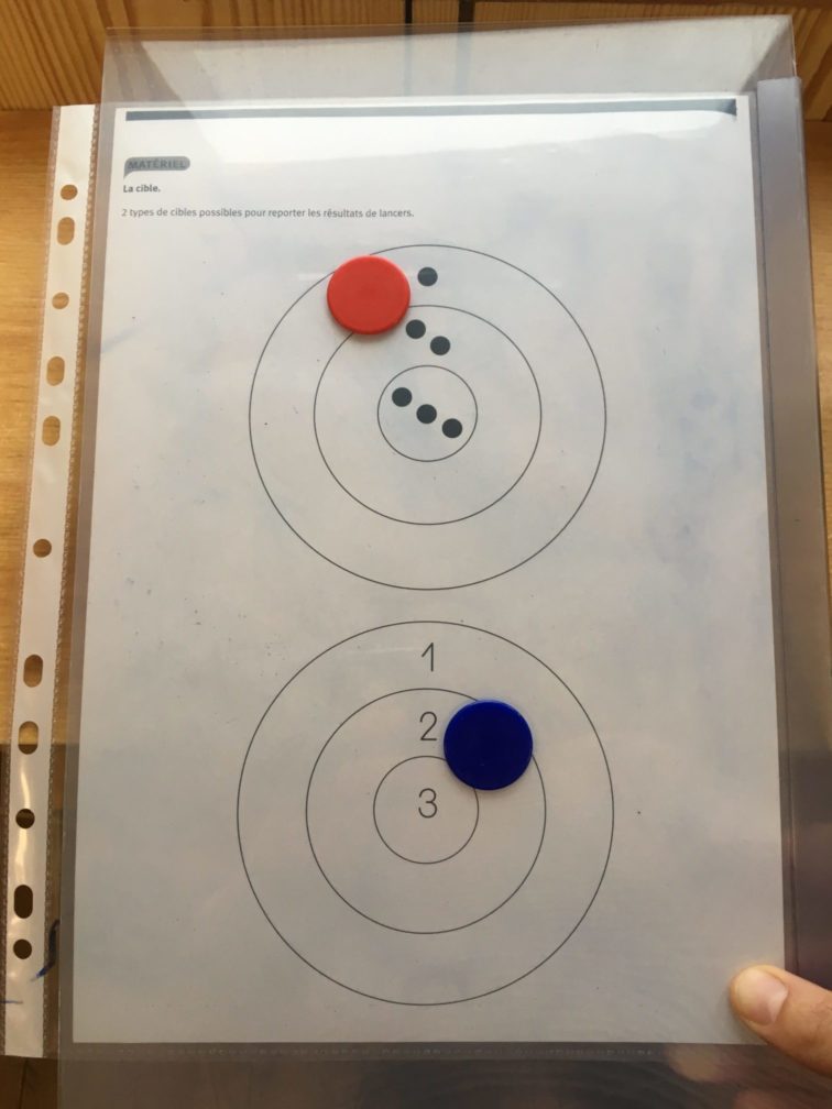 Des élèves de moyenne section jouent avec une cible sur laquelle ils doivent lancer deux jetons puis donner le score total. L’objectif de l’atelier est d’ajouter des quantités allant de 1 à 3.