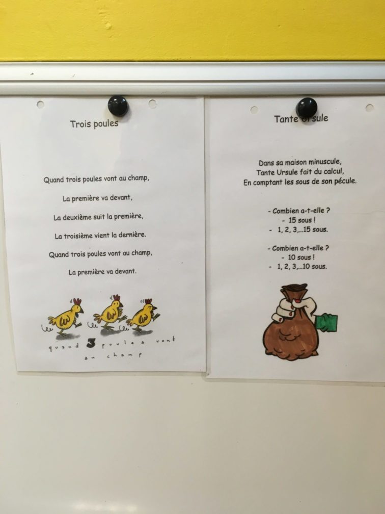 Une poésie apprise fait travailler les nombres ordinaux, l’autre la comptine des nombres aidant à dénombrer une quantité de sous.