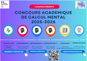Un grand Bravo à tous les participants au Concours Académique de Calcul Mental 2026 Merci aux enseignants qui ont participé à la réussite de tous les élèves à la maîtrise du calcul mental! Voici la liste des gagnants du département de la Charente-Maritime (17) : Les gagnants départementaux sur le blog du GAMS16 : les …
