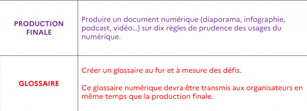 - un document numérique (diaporama, infographie, podcast, vidéo) qui présentera 10 règles de prudence des usages du numérique (en fait une compilation des idées fortes que vous retiendrez de chaque défi).