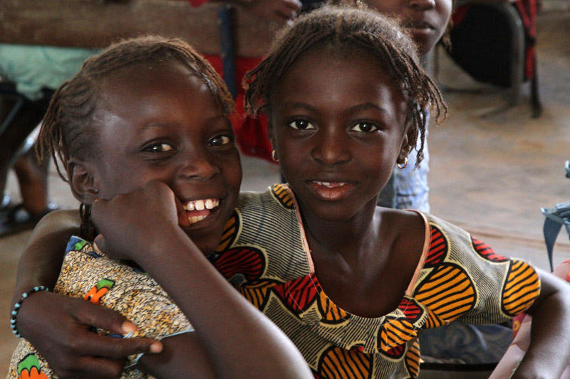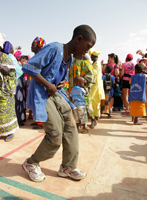 Etonnés mais aucunement dérangés par cette caravane matinale, les jeunes gens levaient à peine la tête de leur filet en remaillage, de leur moteur suintant encore l’huile et de la braise écarlate d’un thé promis.Ce fut enfin un sable mou et dense qui a accompagné les coureuses vers l’école dévoilée après un sinueux parcours dans le petit village de cases en paille.Après avoir récupéré de ses efforts, la troupe a ensuite pu assister à une démonstration de lutte par des enfants de l’école. Encore tout habités du spectacle de la veille où le roi des arènes Yekini a subi sa première défaite devant une foule en transe, les écoliers ont évolué sur la dalle encore fraiche d’un play ground de basket financé et construit par une association Italienne.