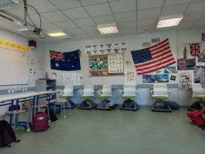 Miss Charrier is our English teacher . In the classroom, there are special chairs, there are many flags ,some food and many posters. There are boardgames and English books too !