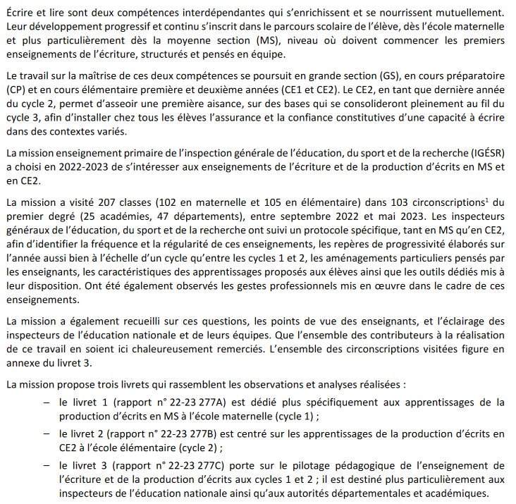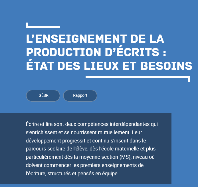 Vous pourrez accéder à l’ensemble du rapport en utilisant le lien suivant : https://www.education.gouv.fr/l-enseignement-de-la-production-d-ecrits-etat-des-lieux-et-besoins-379446