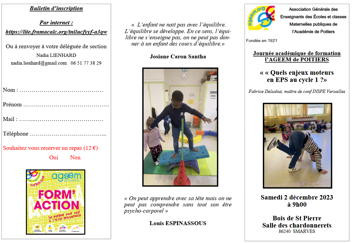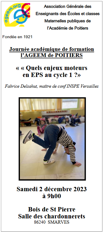 Infos partenaires Journée académique AGEEM – Samedi 2 Décembre – Quels enjeux moteurs en EPS au cycle 1 ? par Olivier ROUSSEL|Publié 6 novembre 2023 Vous trouverez ci-dessous toutes les informations relatives à cet événement ainsi que les modalités de participation…